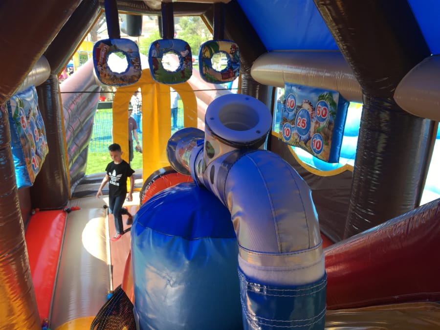 Arrrrr pirates! Kick off your shoes and step up into the pirate ship! This bouncy castle opens kids up to a whole new world of imaginative play. Inside there awaits Long John Silver's ladder to climb, a selection of buccaneering bish bash posts to brawl with, followed by a shiver-me-timbers slide that takes you right back to the beginning where you can start all over again! This pirate galleon inflatable really does provide endless hours of seafaring fun!
